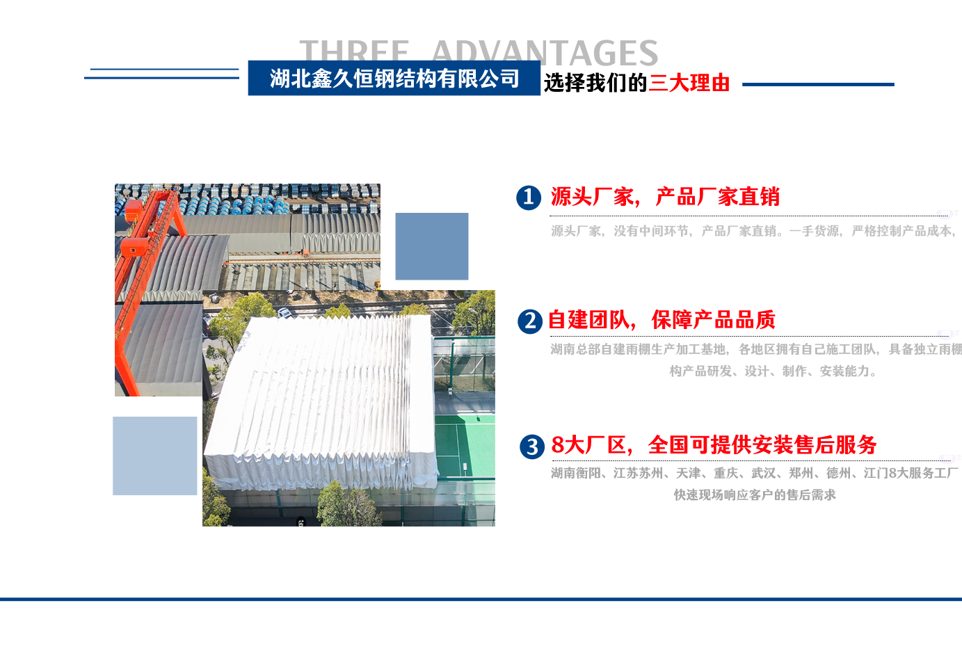 湖北鑫久恒鋼結(jié)構(gòu)有限公司是一家電動雨棚、膜結(jié)構(gòu)車棚研發(fā),生產(chǎn)銷售,施工安裝于一體的專業(yè)鋼結(jié)構(gòu)科技公司,主要產(chǎn)品有伸縮雨棚,電動雨棚,膜結(jié)構(gòu)車棚等。 湖南地區(qū)職員目前有80多人,占地面積20000平方米,廠房面積15600平方米,配備先進(jìn)的生產(chǎn)流水線,使每件品質(zhì)產(chǎn)品的堅實基礎(chǔ)。 公司在蘇州、天津、重慶、武漢、德州、烏魯木齊、江門均設(shè)有服務(wù)工廠,總?cè)藛T共300多人,擁有專業(yè)的技術(shù)團(tuán)隊,配備先進(jìn)的設(shè)備和流水線生產(chǎn),產(chǎn)能高,貨源充足,發(fā)貨速度快,服務(wù)區(qū)域廣。 移動伸縮棚適用于通道臨時倉儲、戶外運動遮陽、污水池遮蓋、能源交通、熱力化工、礦山、船舶制造及市政建設(shè)、物流、碼頭等領(lǐng)域的構(gòu)件制作加工,成品半成品存放、倉庫、野外儀器設(shè)備操作用房等。尤其是對工廠發(fā)貨、倉儲臨時遮雨防嗮,梅雨期較長、建設(shè)周期較短的工程施工等特別適用。還可根據(jù)用戶需求量身定制、適合企業(yè)所需不同款式的產(chǎn)品。 我公司堅持“誠信社會為本,客戶滿意為榮”的經(jīng)營理念,做到質(zhì)量把控,嚴(yán)格管理,精益求精,恪守承諾。使鑫久恒逐步走向成熟,其系統(tǒng)化、專業(yè)化日趨完善。以專業(yè)的技術(shù)、科學(xué)的管理,更高的產(chǎn)品質(zhì)量,優(yōu)良的企業(yè)信譽(yù),真誠的客戶服務(wù),靈活多樣的經(jīng)營方式和務(wù)實創(chuàng)新的企業(yè)精神愿與社會各界攜手合作,為推動智能鋼結(jié)構(gòu)建筑事業(yè)的發(fā)展而不斷努力。...